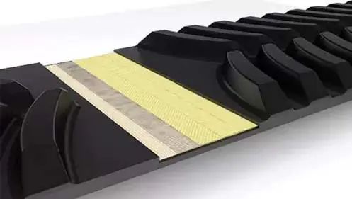 La cuarta capa está ubicada en el lado interno de la banda de rodadura, protege el borde en contacto con las ruedas y rodillos tractores. Además de brindar protección contra impactos de piedras y objetos duros, proporciona soporte estructural adicional para maquinaria pesada.